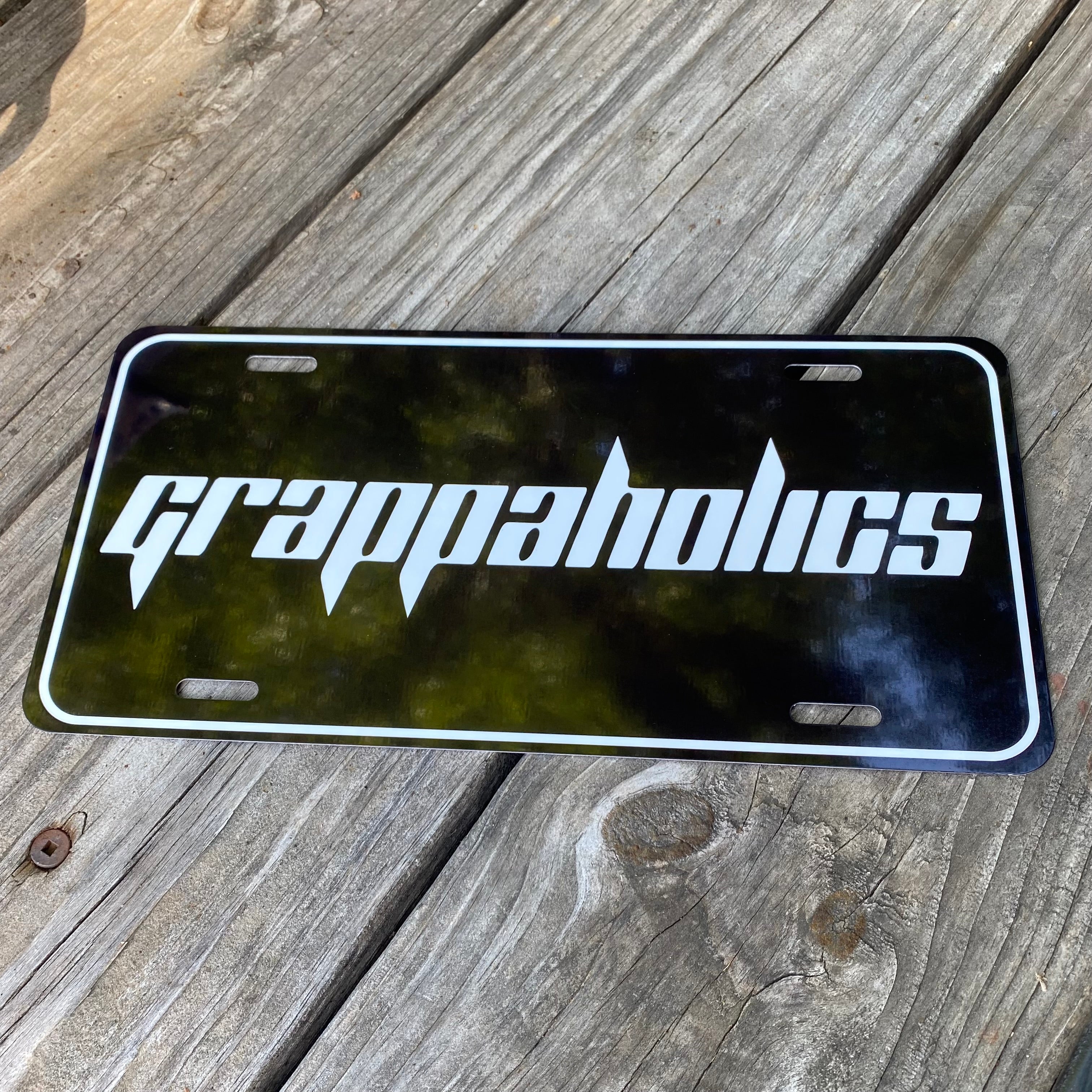 All aluminum plate with Grappaholics in Trail Grappler font on a clean black background with white or chrome lettering.
